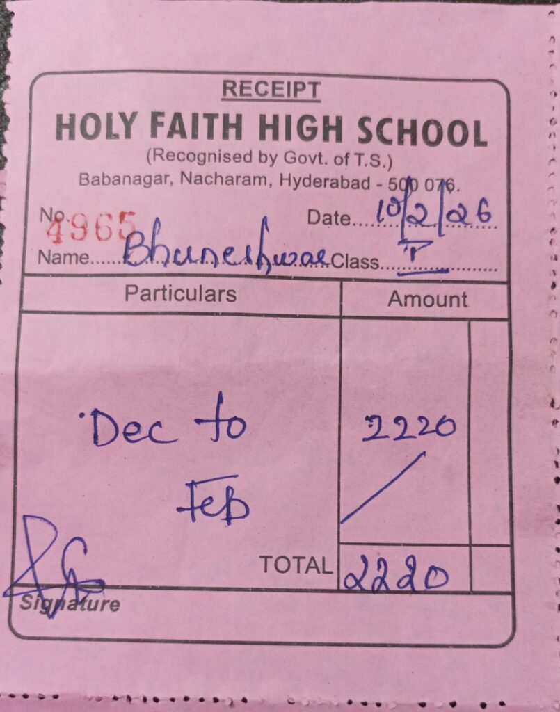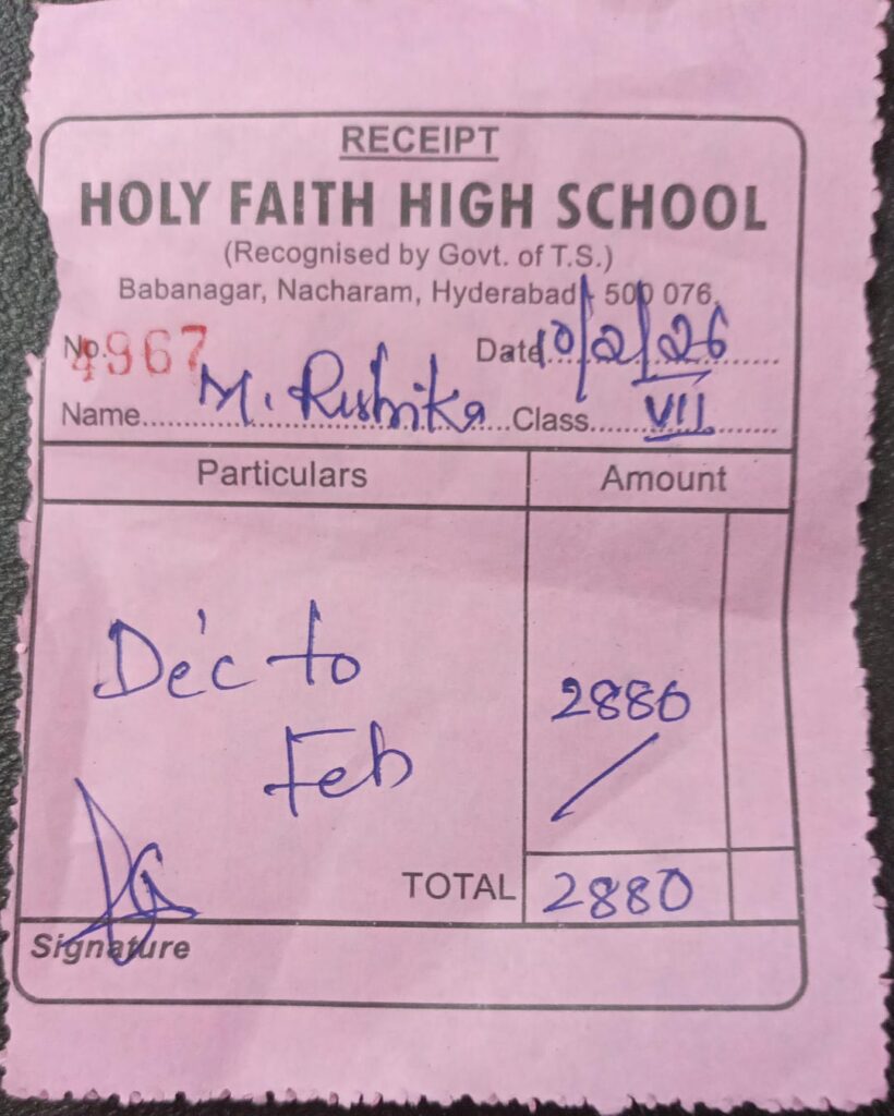 Muskan is 14 years old and studying in 9th grade at Holy Faith High School, Nacharam. She lives with her parents and a younger sister. Her parents work hard to provide for the family, but their limited income makes it difficult to cover educational expenses, including tuition, textbooks, notebooks, project materials, and exam fees.