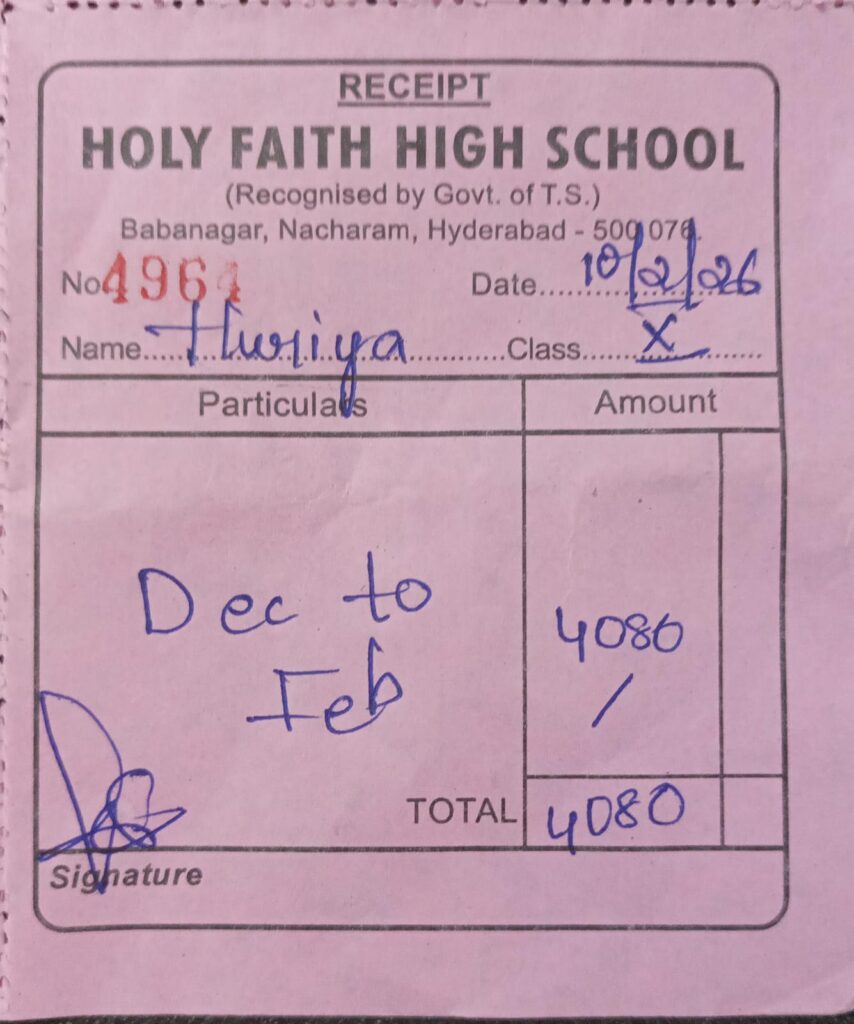 Houriya Begum is a student of 10th standard, at Holy Faith High School, Nacharam. She lives with her mother and siblings under the care of her maternal uncle. Her father struggled with alcohol addiction and eventually left the family, leaving them without emotional or financial support. Her mother is currently unable to work due to personal and health reasons.